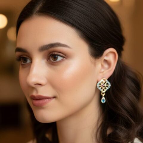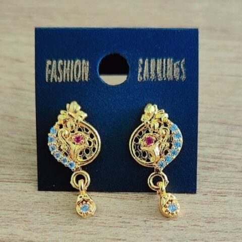 166gold-plated fashion earrings featuring a leaf design with blue and pink stone embellishments and a floral stud top,