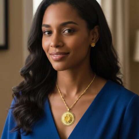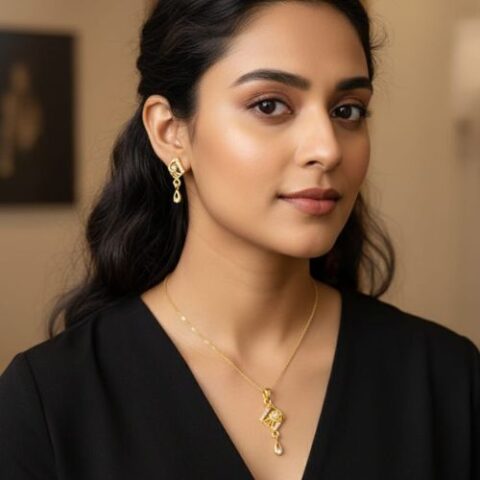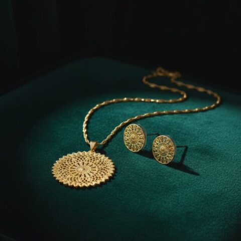 176gold-plated necklace with an intricate, medallion-style pendant and matching star-shaped stud earrings.