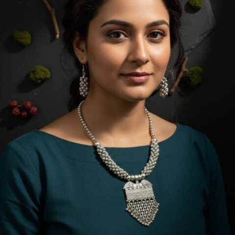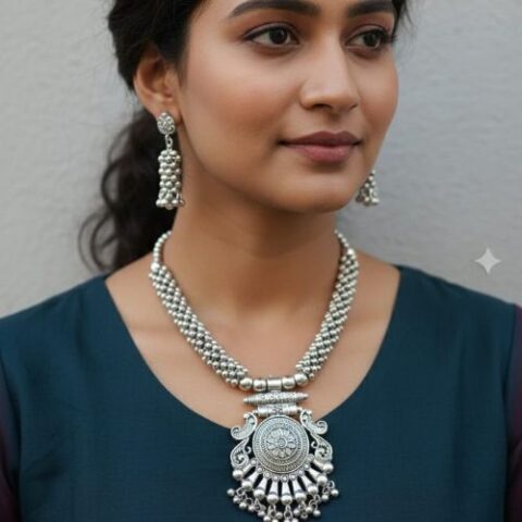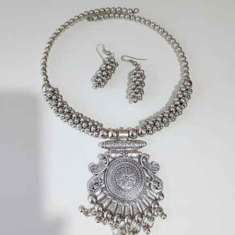 530 oxidized silver tribal or Banjara-style necklace set with ghungroo details.
