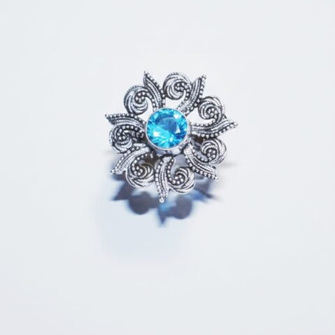 467 This is a pair of oxidized silver jhumka earrings with a turquoise stone and pearl drops.