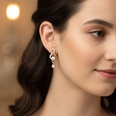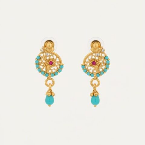 165gold-plated fashion earrings featuring a distinctive design with red and white American Diamond or Cubic Zirconia stones