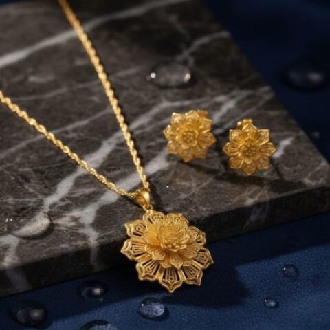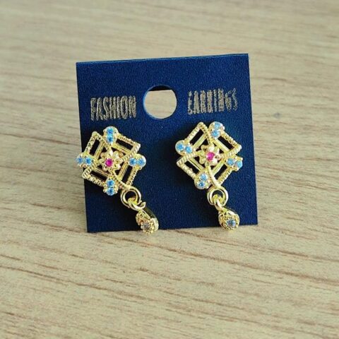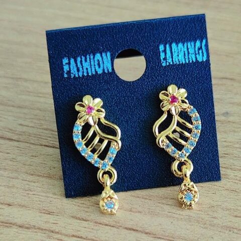 166gold-plated fashion earrings featuring a leaf design with blue and pink stone embellishments and a floral stud top,