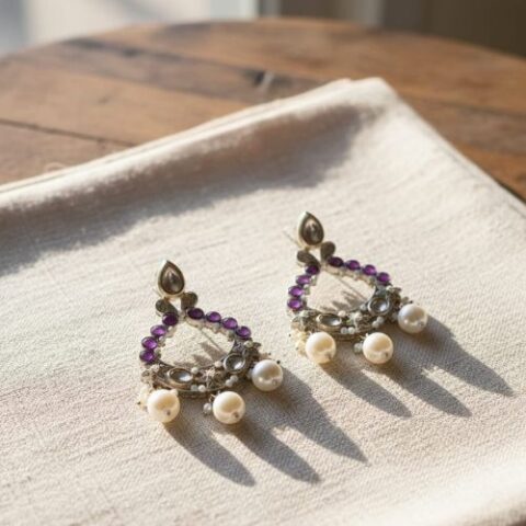 564 oxidised silver style featuring a rectangular purple stone and small dangling pearls