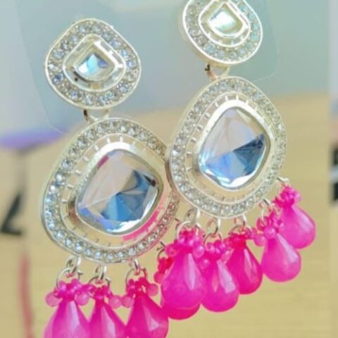 556 kundan-style drop earrings with bright pink bead or crystal dangles. .