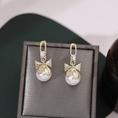 JJK 50 Gold Plated Pearl Bow Drop Earrings with Rhinestones.
