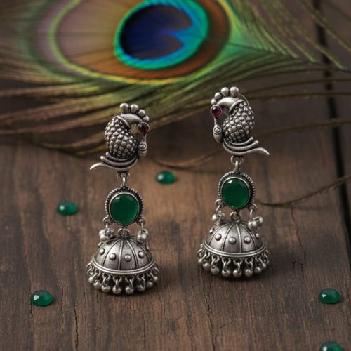 395a Oxidized Silver Peacock Jhumka Earrings are a stunning fusion of traditional artistry and contemporary elegance. Crafted in oxidized silver, these earrings feature an intricate peacock design adorned with vibrant turquoise stones that add a refreshing pop of color. Delicate white pearls embellish the jhumka base, enhancing their charm and movement with every step. Lightweight yet eye-catching, they are perfect for festive occasions, weddings, or cultural celebrations. The intricate detailing and harmonious color combination make these earrings a versatile accessory for sarees, lehengas, or fusion outfits. 395a earrings celebrate heritage, elegance, and timeless style, making them a statement piece for any jewelry collection.