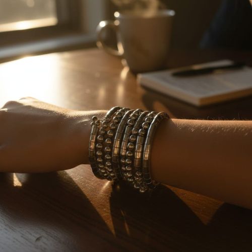 522A Oxidized Silver Coil or Spiral Bracelets are a striking fusion of traditional artistry and contemporary design. Crafted from oxidized silver, these bracelets feature an elegant spiral or coil structure that wraps gracefully around the wrist, creating a unique and eye-catching look. The intricate detailing enhances their artisanal charm, while the oxidized finish adds a rustic, vintage appeal. Lightweight and comfortable, they are perfect for everyday wear, festive occasions, or casual ethnic styling. Ideal for pairing with both traditional and fusion outfits, 522A bracelets make a bold yet sophisticated statement, celebrating heritage, craftsmanship, and modern fashion sensibilities in one versatile accessory.