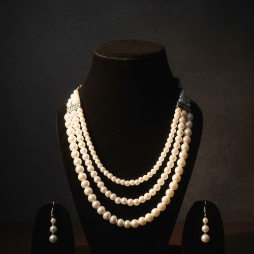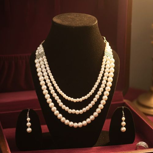 526 Three-Strand White Pearl Necklace Set is a timeless expression of elegance and grace. Featuring three beautifully layered strands of lustrous white pearls, this necklace creates a rich, sophisticated look that never goes out of style. Paired with matching pearl drop earrings, the set offers a perfectly coordinated finish for any special occasion. The classic design enhances both traditional and contemporary outfits, making it ideal for weddings, festive events, or formal gatherings. Lightweight and comfortable to wear, it adds refined charm without overwhelming your look. 526 Pearl Necklace Set embodies purity, luxury, and timeless beauty, making it a must-have addition to any jewelry collection.