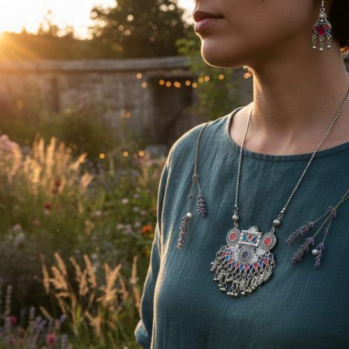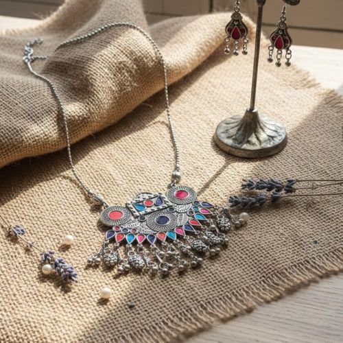527 Large Silver-Toned Statement Necklace Set is designed to make a bold and unforgettable impression. Featuring an intricately crafted silver-toned necklace accented with striking red details, this set exudes elegance and dramatic flair. The matching drop earrings beautifully complement the necklace, creating a cohesive and eye-catching look. Perfect for festive occasions, weddings, or evening events, the rich red accents add warmth and contrast to the metallic finish. Despite its statement size, the set is comfortable to wear and easy to style with ethnic or fusion outfits. 527 Necklace Set is a powerful blend of sophistication, artistry, and standout style for confident, modern fashion lovers.