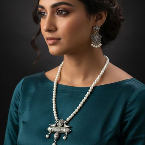 528 Traditional Indian Pearl Necklace and Earring Set is a graceful celebration of timeless beauty and cultural elegance. Featuring lustrous pearls arranged in a classic traditional design, this set reflects refined craftsmanship and rich Indian heritage. The matching earrings perfectly complement the necklace, creating a harmonious and elegant look. Ideal for weddings, festive occasions, and traditional ceremonies, this set enhances ethnic attire such as sarees and lehengas with effortless charm. Lightweight and comfortable, it offers both beauty and ease of wear. 528 Pearl Necklace Set embodies purity, sophistication, and tradition, making it a must-have accessory for those who appreciate classic Indian jewelry with enduring appeal