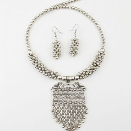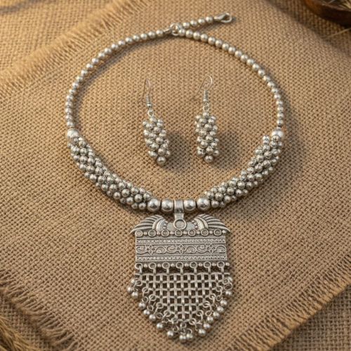 530 Oxidized Silver Tribal Necklace Set is a bold expression of traditional Banjara-inspired artistry. Crafted in oxidized silver tones, this striking set features intricate detailing and classic ghungroo accents that add rhythmic movement and a rustic charm. The statement necklace is beautifully complemented by matching earrings, creating a powerful and cohesive tribal look. Perfect for festive occasions, cultural events, or fusion styling, it pairs effortlessly with ethnic and boho outfits. Despite its bold appearance, the set is comfortable to wear. 530 Necklace Set celebrates heritage, craftsmanship, and fearless style, making it an ideal choice for those who love distinctive, cultural jewelry with a strong, artistic presence.