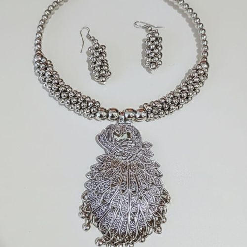 533 Traditional Oxidized Silver Peacock Pendant Necklace Set is a graceful tribute to timeless Indian artistry. Featuring a beautifully detailed peacock pendant crafted in oxidized silver, this set symbolizes elegance, beauty, and cultural heritage. The intricate design highlights fine craftsmanship, while the matching earrings complete the look with balanced sophistication. Perfect for festive occasions, weddings, or cultural celebrations, it pairs effortlessly with sarees, lehengas, and ethnic wear. Lightweight and comfortable, the set offers both style and ease of wear. 533 Peacock Necklace Set is a stunning statement of tradition and elegance, making it an ideal choice for those who appreciate classic Indian jewelry with artistic charm.