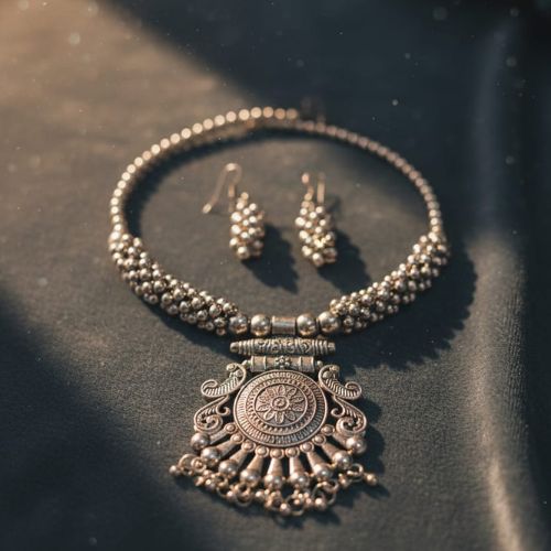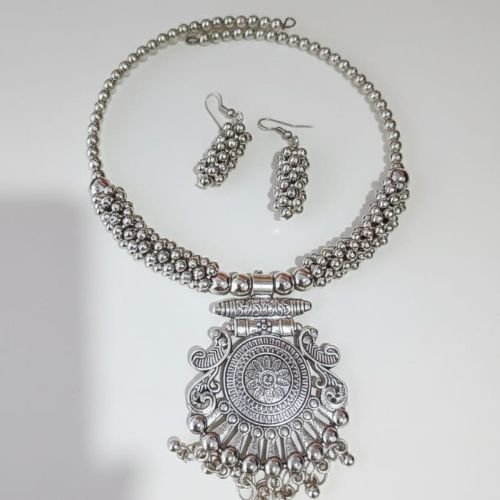 535 Traditional Oxidised Silver Pendant Necklace and Earring Set is a captivating blend of cultural elegance and timeless craftsmanship. The intricately designed oxidised silver pendant serves as the centerpiece, showcasing delicate patterns that reflect traditional Indian artistry. Complemented by matching earrings, the set creates a harmonious and sophisticated look. Perfect for weddings, festivals, and special occasions, it enhances ethnic outfits like sarees, lehengas, and kurtas with grace and charm. Lightweight and comfortable, it allows for effortless wear throughout the day. 535 Necklace Set is a statement of heritage, style, and refined beauty, ideal for those who appreciate classic Indian jewelry with artistic finesse.