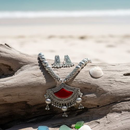 538 oxidised plated necklace set with a red stone accent.