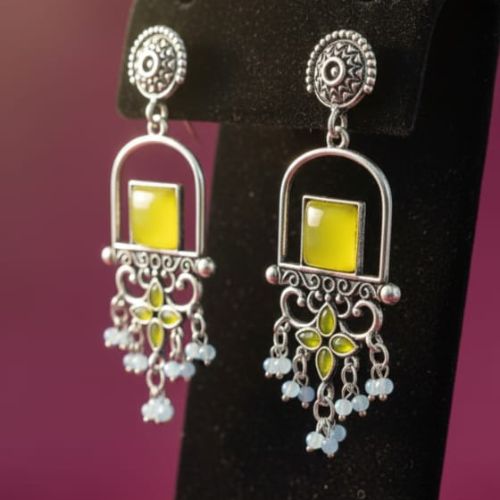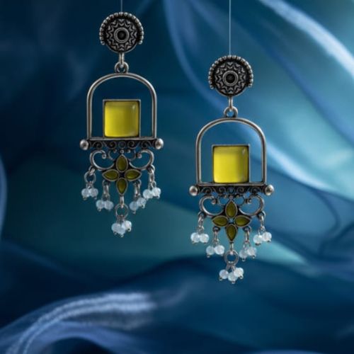 Elevate your accessory game with the 559 Oxidized Rectangle Stone Earrings with Pearl Detailing, crafted in a stylish blend of yellow and silver-plated alloy. Featuring a unique rectangular stone centerpiece adorned with delicate pearl accents, these earrings exude contemporary charm with a touch of traditional elegance. The oxidized finish enhances the intricate detailing, creating a striking visual appeal perfect for festive occasions, cultural events, or chic everyday styling. Lightweight and comfortable, they ensure effortless wear while adding a sophisticated flair to any outfit. The 559 Earrings seamlessly combine modern design, artisanal craftsmanship, and timeless elegance in one versatile piece.
