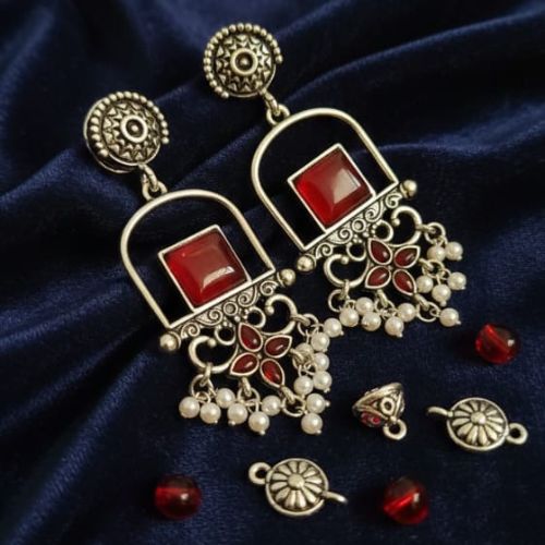 Make a bold and elegant statement with the 560 Zoey Maroon Silver-Plated Oxidised Dangler Earrings. Featuring a rich maroon hue and intricate oxidised silver-plated detailing, these earrings exude a perfect blend of traditional charm and contemporary style. The dangler design ensures graceful movement, adding a dynamic and eye-catching element to any ensemble. Lightweight yet striking, they provide comfortable wear for festive occasions, weddings, parties, or casual ethnic styling. Perfectly paired with sarees, lehengas, or fusion outfits, the 560 Zoey Dangler Earrings bring vibrancy, sophistication, and artisanal elegance, making them a versatile and timeless addition to your jewelry collection.