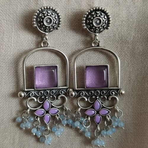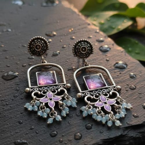 These 564 oxidised silver-style earrings showcase a striking blend of elegance and sophistication. Each earring features a rectangular purple stone, beautifully set to catch the light and add a pop of rich color. Accented with small, delicate dangling pearls, they create a graceful movement with every gesture. The oxidised silver-tone finish enhances their vintage-inspired charm, giving them a subtle, artisanal appeal. Perfect for both formal occasions and stylish everyday wear, these earrings effortlessly elevate any outfit. Their unique combination of bold gemstone, gentle pearls, and classic oxidised silver design makes them a versatile and captivating addition to any jewelry collection.