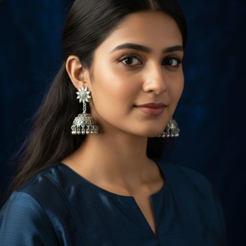 The 570 oxidised silver jhumka earrings showcase classic elegance with a touch of vintage charm. Designed in a timeless jhumka silhouette, these earrings feature intricate detailing that highlights traditional craftsmanship. The oxidised silver finish adds depth and an antique-inspired look, making them perfect for ethnic and fusion styles. Lightweight yet striking, they sway gracefully with every movement, enhancing your overall look. Ideal for festive occasions, celebrations, or everyday ethnic wear, these jhumkas pair beautifully with sarees, kurtas, and lehengas. A versatile and stylish accessory, they bring heritage-inspired beauty and refined sophistication to any jewelry collection.