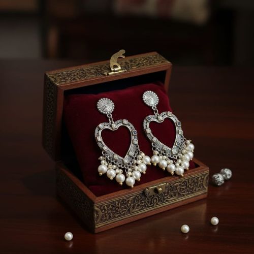 578 xidized silver heart-shaped jhumka earrings with pearl drops