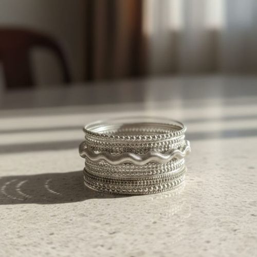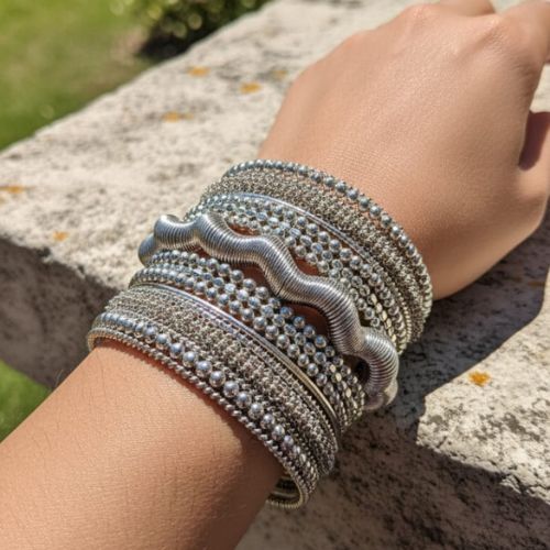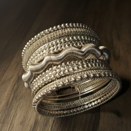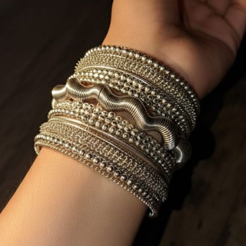 Elevate your traditional jewelry collection with these 591 oxidised silver-plated bangles, designed to blend classic charm with contemporary style. Crafted from durable metal and finished with a rich oxidised silver plating, these bangles feature intricate patterns that add texture and elegance to any outfit. Their timeless design makes them perfect for festivals, weddings, parties, or everyday ethnic wear. Lightweight and comfortable, they are easy to stack or wear individually, enhancing versatility in styling. Ideal for gifting or resale, these bangles offer a perfect balance of durability, sophistication, and cultural appeal, making them a must-have accessory for every jewelry enthusiast.