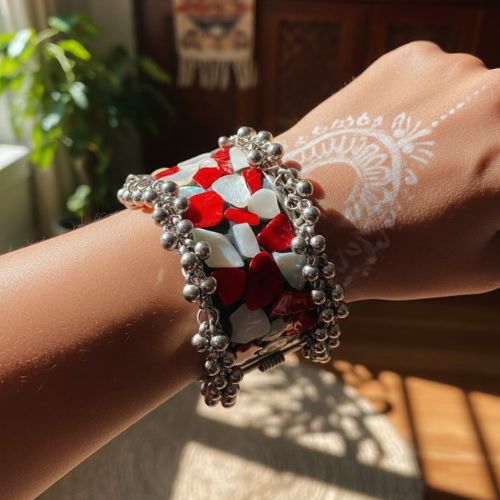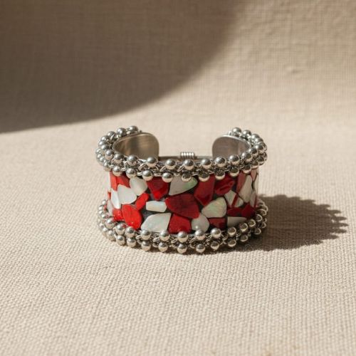 Add a touch of bold elegance to your jewelry collection with this 607 Krelin Women Silver-Toned & Red Oxidised Cuff Bracelet. Beautifully crafted with a striking combination of silver-toned metal and rich red oxidised accents, this cuff offers a perfect blend of traditional charm and contemporary style. The intricate detailing enhances its artisanal appeal, while the open cuff design ensures a comfortable and adjustable fit. Ideal for festivals, cultural events, parties, or everyday ethnic styling, it pairs effortlessly with sarees, kurtas, and fusion outfits. Lightweight yet durable, this statement bracelet is perfect for gifting or resale, making it a standout accessory with timeless sophistication.