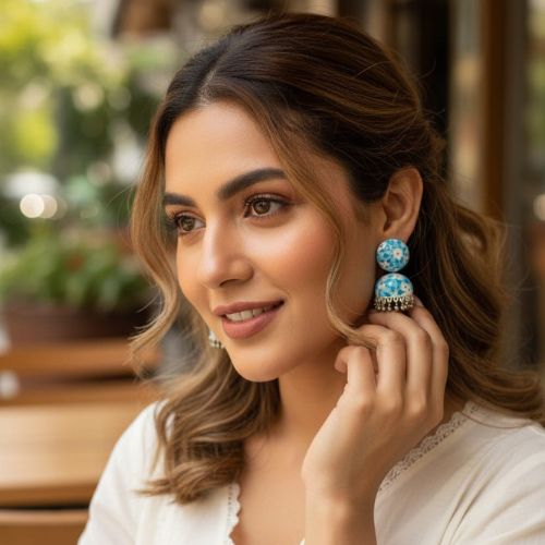 Add a pop of color and traditional elegance to your jewelry collection with the 72H Blue Fancy Oxidised Jhumka Earrings. Crafted with intricate oxidised silver work, these earrings feature beautiful blue accents that bring a vibrant touch to the classic jhumka design. The detailed craftsmanship and antique finish create a perfect balance of heritage and style. Lightweight and comfortable, they are ideal for festive occasions, weddings, or casual ethnic wear. Pair them effortlessly with sarees, lehengas, or fusion outfits for a charming, eye-catching look. A perfect blend of tradition and trend, these earrings are a must-have accessory.