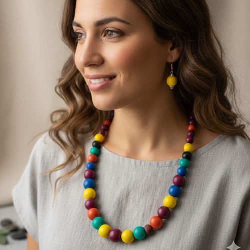 Add a splash of vibrant charm to your look with this colorful bead necklace and matching dangle earrings set. Featuring a lively mix of multicolored beads, the necklace brings a playful yet stylish touch to any outfit, making it perfect for casual wear, beach outings, or festive occasions. The coordinated dangle earrings echo the necklace’s vibrant palette, creating a cohesive and eye-catching ensemble. Lightweight and comfortable, this set offers effortless style with a boho-chic flair. Whether you’re accessorizing a simple dress or layering with other pieces, this colorful bead jewelry set adds personality, fun, and flair to your accessory collection.