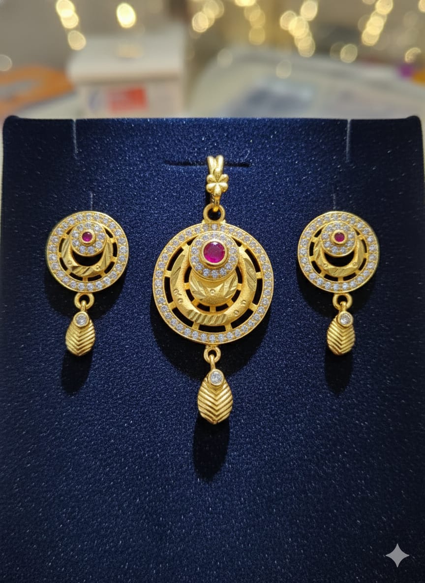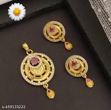 Elevate your look with this Designer High Gold Plated Premium Quality Fancy Forming Pendant Set with Earrings. Crafted with precision and elegance, this exquisite set features a beautifully designed pendant with a rich high-gold polish that radiates luxury and charm. The intricate forming work adds a touch of sophistication, while the matching earrings complete the set with perfect harmony. Made from premium-quality materials, it offers durability, long-lasting shine, and comfortable wear. Ideal for weddings, parties, and festive occasions, this set pairs effortlessly with both traditional and contemporary outfits. A perfect gift or personal treasure, it defines timeless beauty and style.