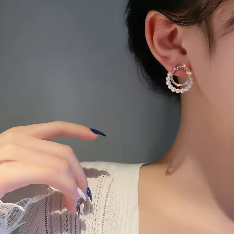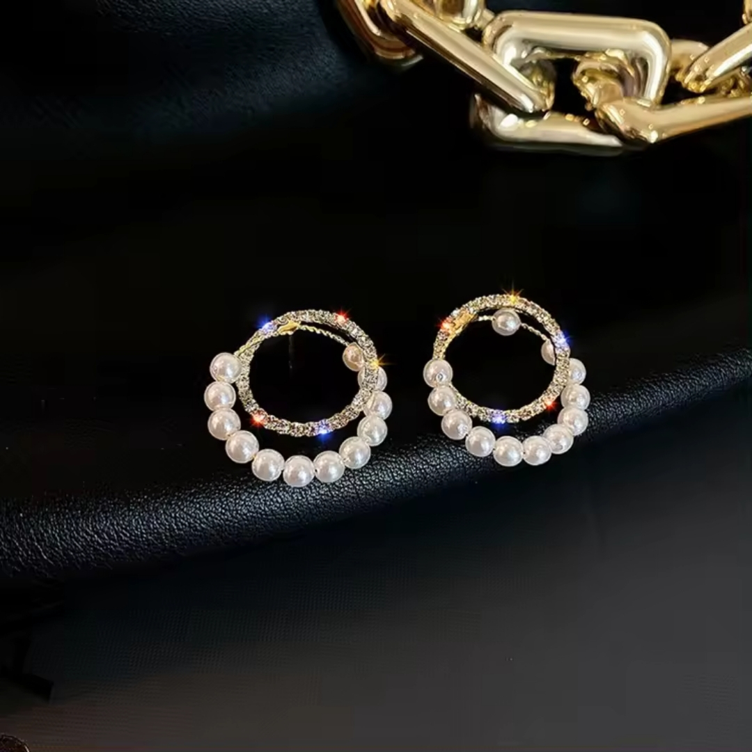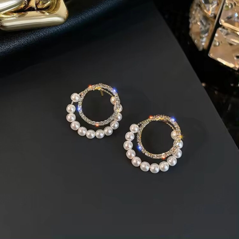 78Double Circle Rhinestone Pearl Hoop Earrings.