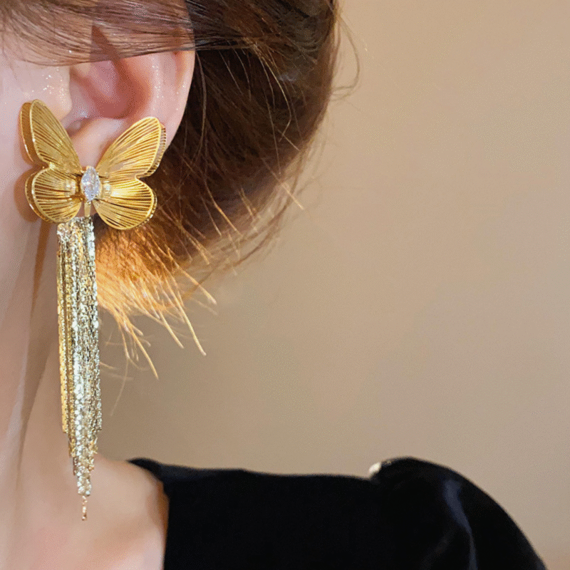 Elevate your style with the Estailo Shining Butterfly Long Chain Earrings, a perfect blend of elegance and whimsy. These earrings feature delicate butterfly charms suspended from graceful, shimmering chains that catch the light with every movement. The sparkling design adds a touch of glamour, making them ideal for special occasions or adding sophistication to everyday outfits. Lightweight and comfortable, their long, flowing silhouette creates a stunning statement without overwhelming your look. Inspired by nature’s beauty and modern fashion, these earrings bring a playful yet refined charm to any jewelry collection. A must-have accessory for those who love graceful, eye-catching style.