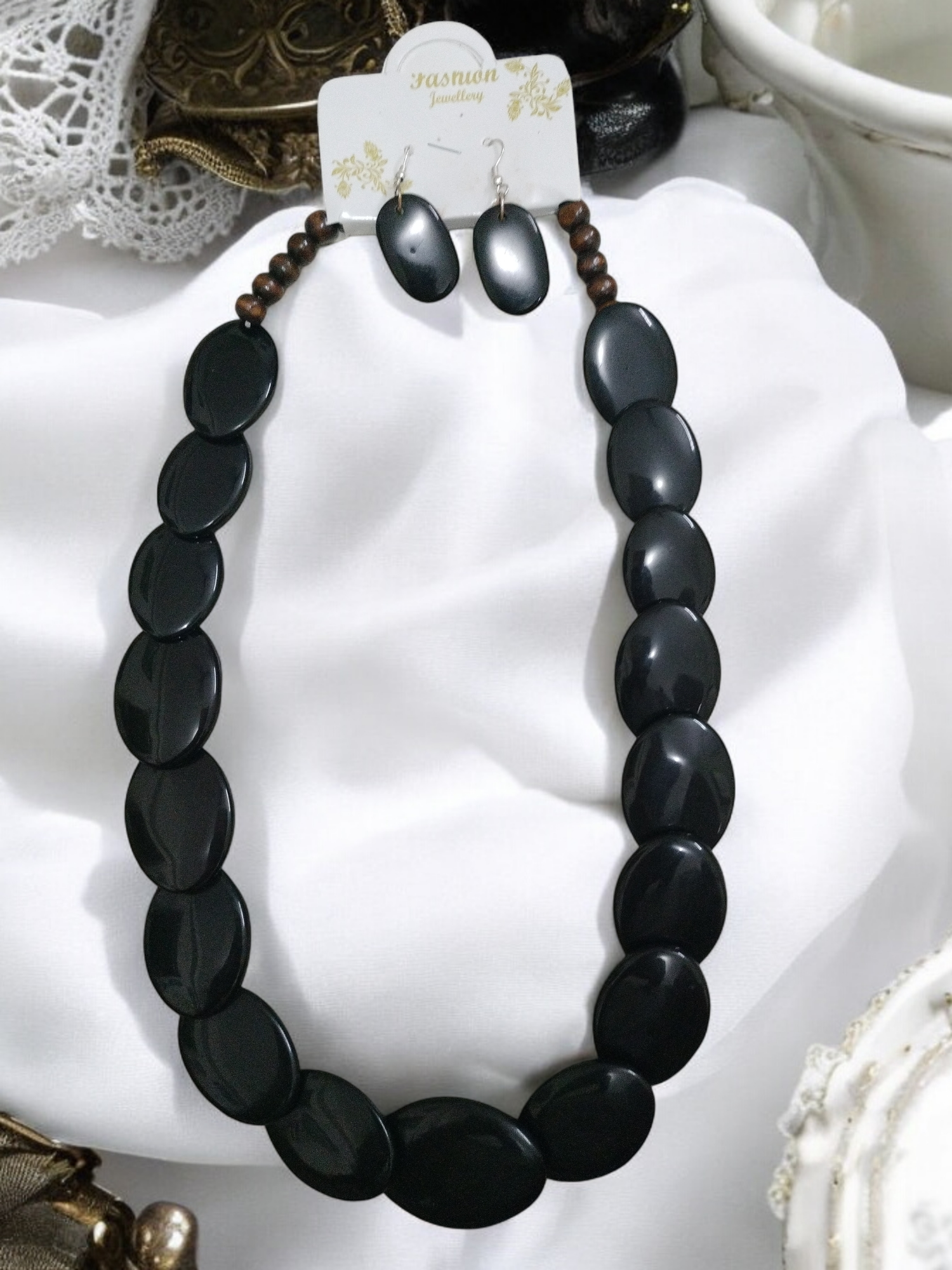 Elegant Fancy Resin Black Necklace Set with oval-shaped black resin stones. Perfect for parties, special occasions, and everyday style! ✨