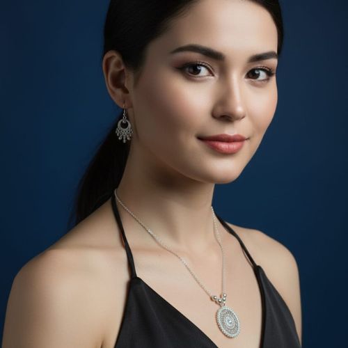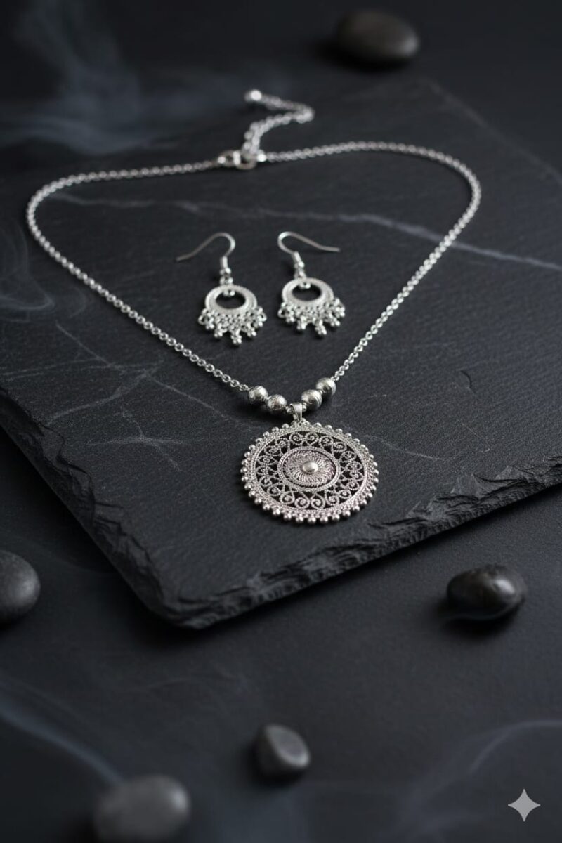 Elevate your ethnic style with this exquisite German Silver Necklace Set, featuring a beautifully crafted round pendant that exudes traditional charm. Made from high-quality German silver, the necklace showcases intricate detailing and is adorned with delicate ghunghru beads that add a rhythmic jingle and festive appeal. The antique finish enhances its vintage look, making it perfect for weddings, festivals, and cultural events. Lightweight and comfortable, this set pairs effortlessly with sarees, lehengas, and kurtis, adding elegance and grace to any outfit. A must-have accessory for those who appreciate classic craftsmanship with a touch of playful sophistication.