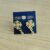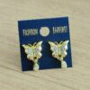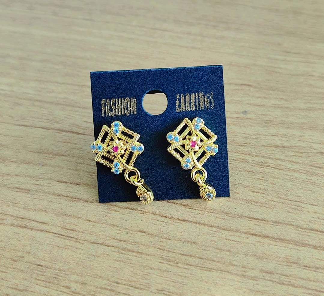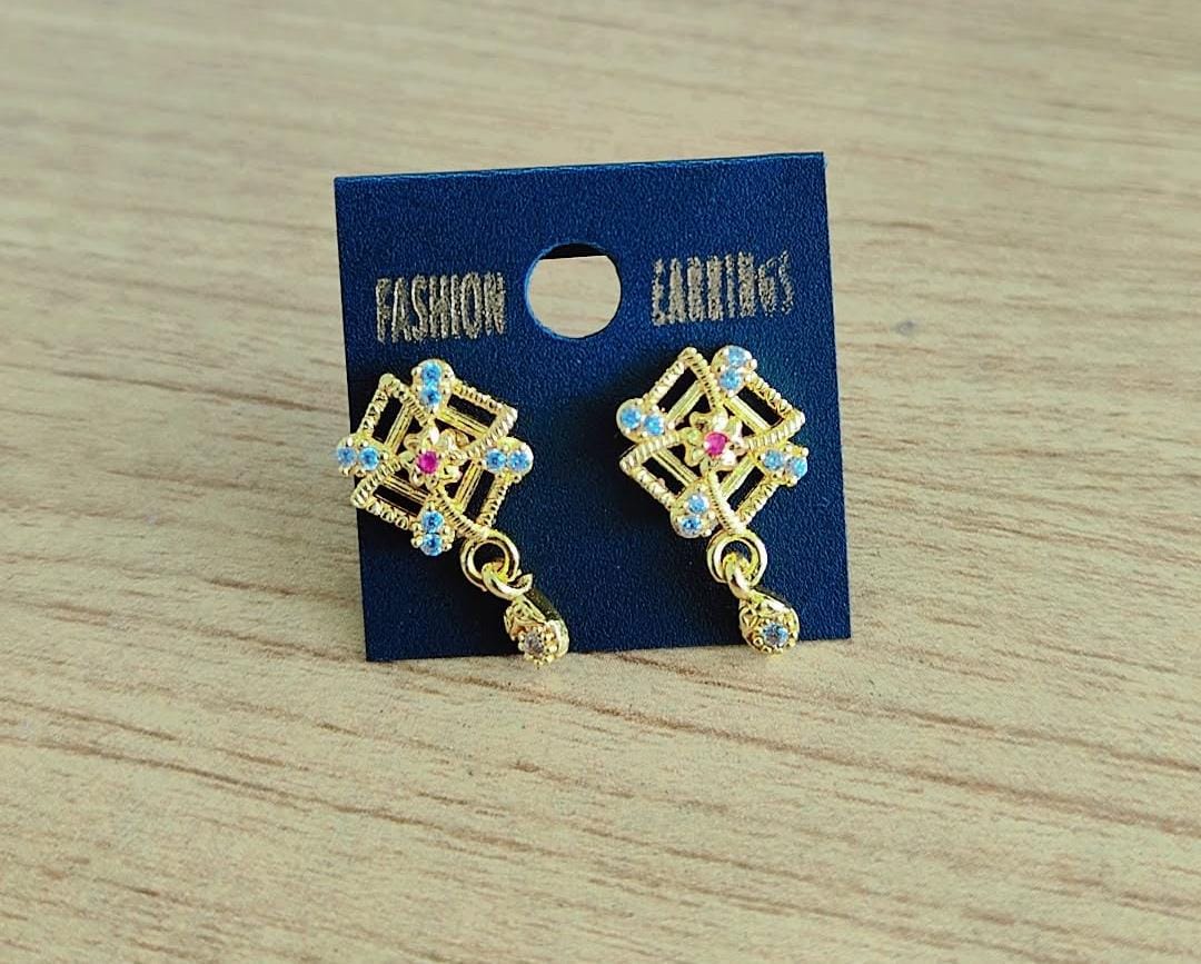 gold-plated fashion earrings featuring a square design adorned with colorful stones, including blue and red accents, presented on a dark blue display card labeled “FASHION EARRINGS