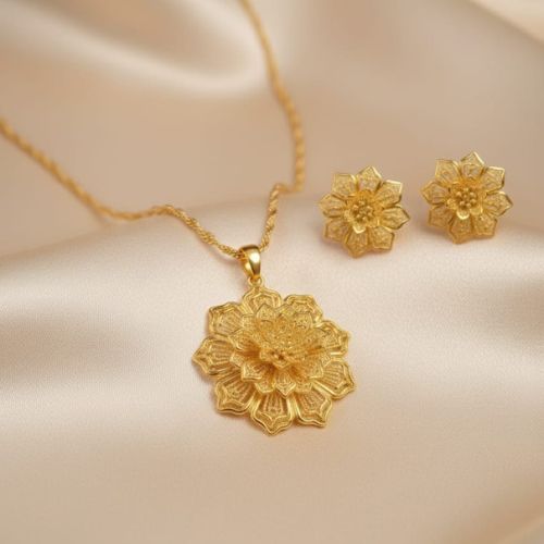 Add a touch of nature-inspired elegance to your look with this stunning gold-plated flower pendant necklace set. Beautifully crafted, the pendant features a delicate floral design finished in radiant gold plating that captures the essence of grace and femininity. Paired with matching earrings, this set offers a complete and charming look, perfect for both casual wear and special occasions. The intricate detailing and high-quality finish make it a standout accessory, while the lightweight design ensures comfort throughout the day. Whether paired with ethnic or contemporary outfits, this flower pendant set brings timeless beauty and a subtle sparkle to your style.