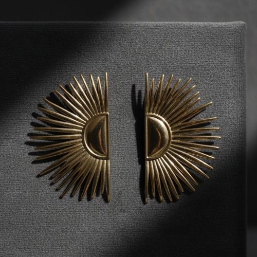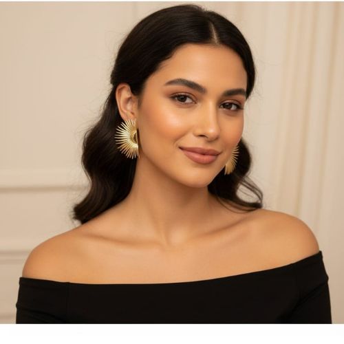 Brighten your look with the Gold Plated Half Sun / Fan-Shaped Earrings, a perfect blend of modern design and timeless elegance. Featuring a unique fan-shaped silhouette reminiscent of a radiant half sun, these earrings catch the light beautifully with their luxurious gold plating. Lightweight and comfortable, they effortlessly elevate both casual and formal outfits, adding a bold yet sophisticated touch. Crafted from high-quality materials, they offer durability and a lasting shine. Whether for everyday wear or special occasions, these earrings make a stylish statement and a versatile addition to any jewelry collection, celebrating beauty and confidence with every wear.