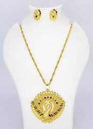 gold-plated jewelry set with a distinctive peacock pendant and matching stud earrings.