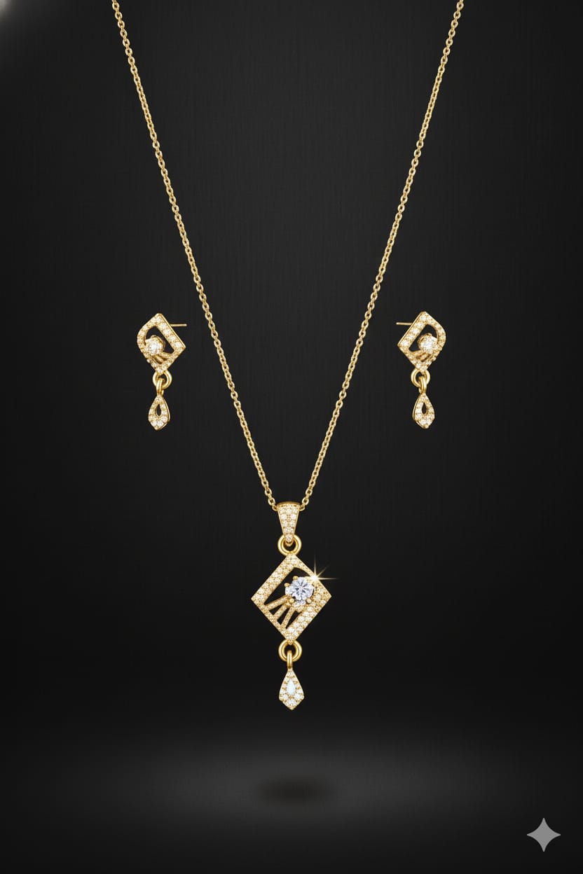 Add a touch of elegance to your ensemble with this stunning gold-plated pendant set, beautifully adorned with sparkling American Diamonds (Cubic Zirconia). Designed to capture light from every angle, the finely cut stones radiate brilliance, giving you a luxurious look without the heavy price tag. The rich gold plating enhances its charm, making it an ideal accessory for both casual outings and special occasions. Lightweight, durable, and skin-friendly, this pendant set includes matching earrings to complete your look. Perfect as a thoughtful gift or a stylish addition to your own collection, this timeless piece exudes grace and sophistication.