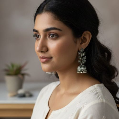 Add a touch of nature-inspired elegance to your jewelry collection with these stunning Golden Leaf Jhumki Earrings. Crafted with exquisite detailing, these earrings feature delicate leaf motifs that gracefully cascade into the classic jhumki shape, all finished in a rich golden hue. Lightweight and comfortable, they effortlessly elevate both traditional and contemporary outfits. Perfect for weddings, festivals, or casual ethnic wear, these earrings bring a warm, radiant glow to any look. Their intricate design and timeless appeal make them a versatile accessory that complements sarees, lehengas, and fusion styles alike, adding charm and sophistication to your ensemble.