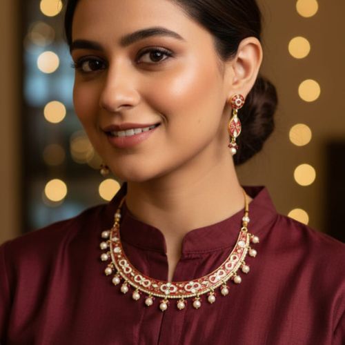 The Hasli necklace set is a timeless piece of traditional Indian jewelry, characterized by its rigid, collar-style design that sits gracefully around the neck. Crafted from high-quality materials such as brass, silver, or alloy, these sets are often adorned with intricate meenakari (enamel) work, Kundan stones, and pearls. The central pendant typically features motifs inspired by Indian heritage, including deities, floral patterns, or geometric shapes. Paired with matching earrings, the Hasli set enhances the elegance of festive attire, making it a preferred choice for weddings, cultural ceremonies, and special occasions. Its adjustable design ensures a comfortable fit, allowing it to complement various necklines and styles