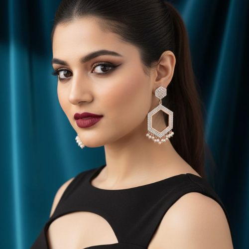 Stand out with elegance in these beautifully crafted Hexagon Jhumka Earrings, a modern twist on a traditional design. Featuring a unique hexagon-shaped stud paired with a classic bell-shaped drop, these earrings blend geometric style with ethnic charm. Intricate detailing and fine craftsmanship enhance their appeal, making them perfect for festive occasions, weddings, or cultural celebrations. Lightweight and comfortable to wear, they add a bold yet graceful touch to any outfit, from sarees and lehengas to fusion wear. These Hexagon Jhumka Earrings are a perfect blend of tradition and contemporary flair, making them a must-have in your jewellery collection.