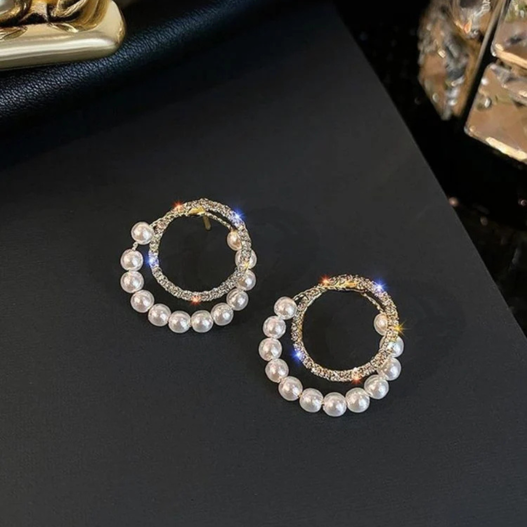JJK 28 Double Circle Pearl and Rhinestone Earrings or Double Circle Diamond Rhinestone Pearl Earrings.