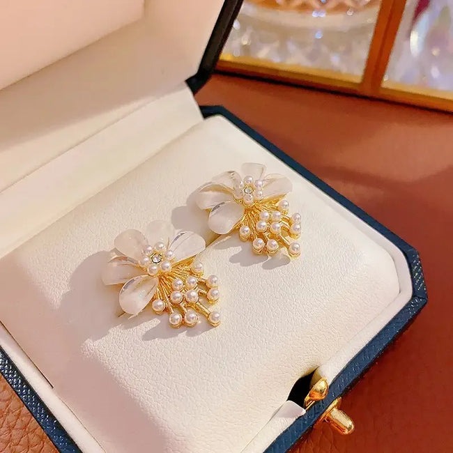 Delicate and enchanting, the Fairy Flower Pearl Earrings embody the grace of Korean elegance with a whimsical touch. Featuring intricately crafted floral motifs, each earring is adorned with a lustrous pearl at its center, symbolizing purity and timeless beauty. The gentle shimmer and soft design evoke a fairy-tale charm, making them the perfect accessory for both everyday sophistication and special occasions. Lightweight and comfortable to wear, these earrings showcase the artistry of Korean jewelry with a modern twist. Whether you’re dressing up or adding a touch of magic to your look, these earrings bring femininity and elegance to every moment.