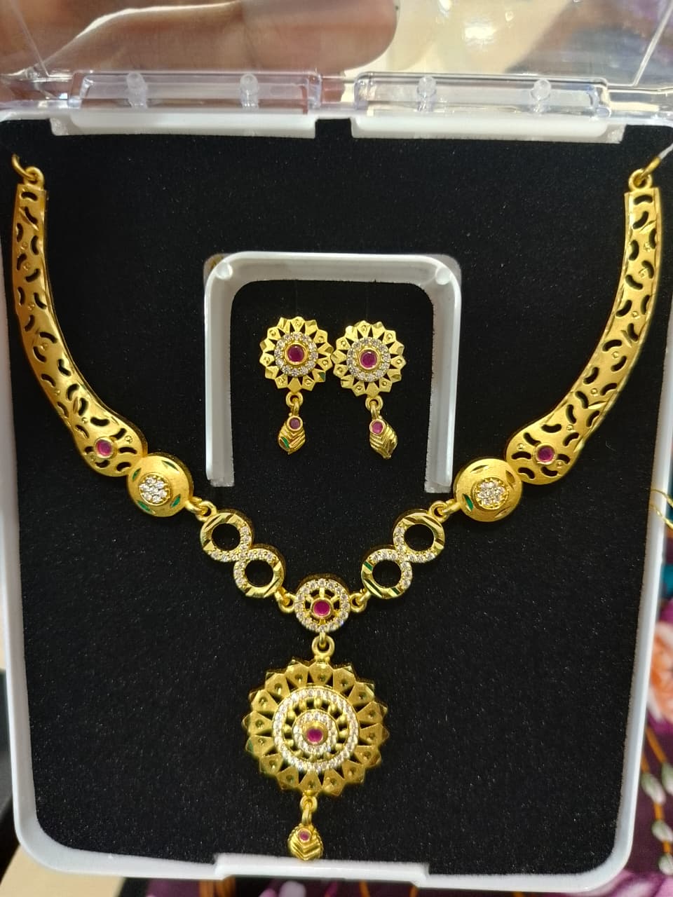 Add a touch of elegance to your ensemble with the Kalpna Sales Surat Gold Plated Austrian Stone Necklace Set. This beautifully crafted set features a radiant gold-plated necklace adorned with sparkling Austrian stones, offering a perfect blend of traditional charm and modern style. The intricate design showcases fine craftsmanship, making it ideal for weddings, festive occasions, or special celebrations. Paired with matching earrings, the set completes your look with grace and sophistication. Lightweight and comfortable for extended wear, it adds a luxurious touch to any outfit. Shine with confidence and timeless beauty in this exquisite jewellery set from Kalpna Sales Surat.