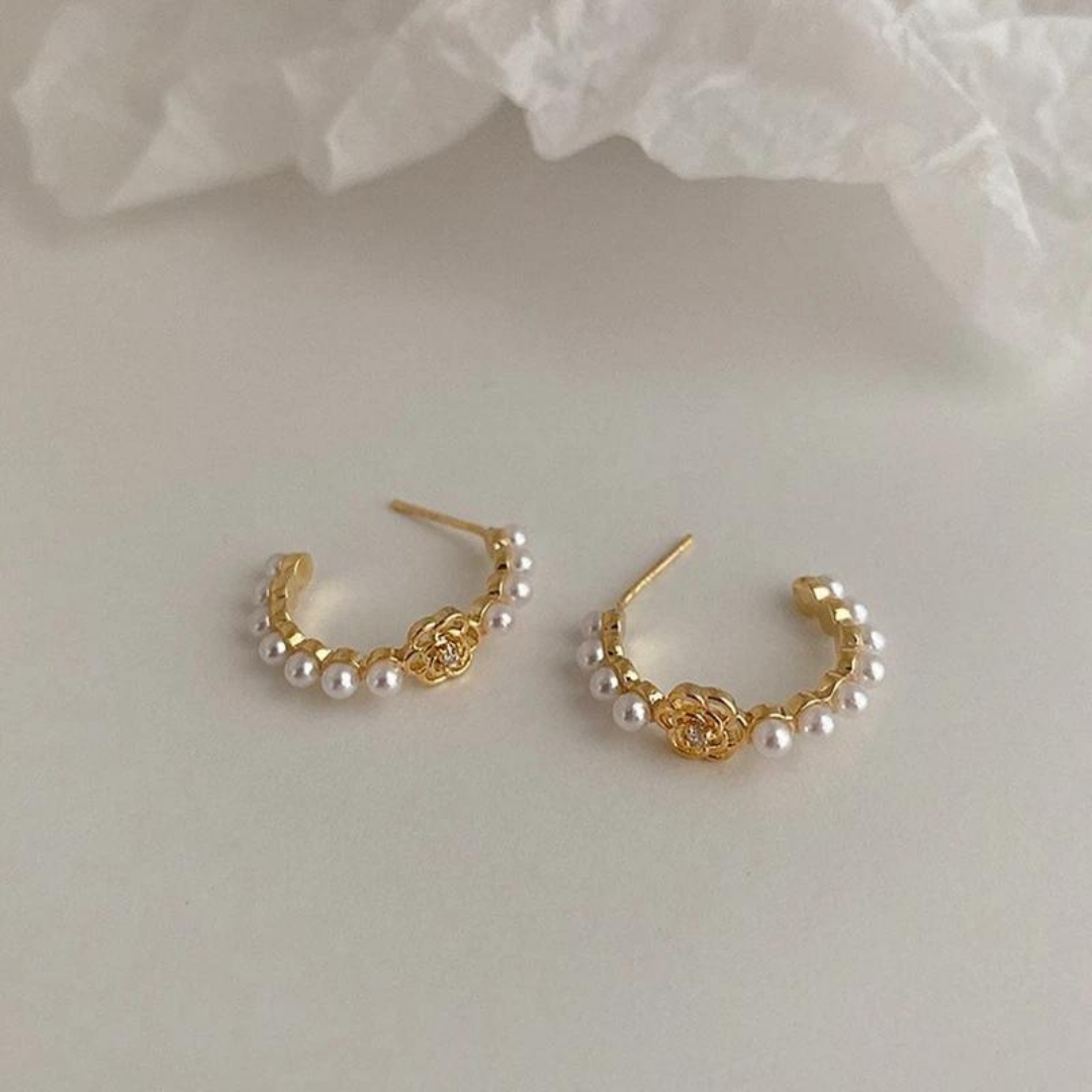 270 Korean White Pearl Flower Hoop Earrings or Camellia Pearl Hoop Earrings.