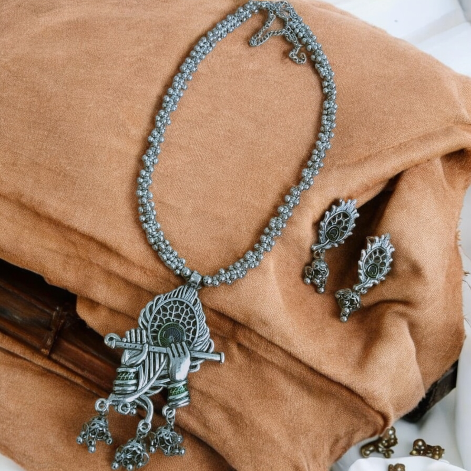 Elegant Krishna Flute Oxidised Jewellery Set with intricate detailing and a vintage finish. Perfect for festive, ethnic, and spiritual wear! ✨