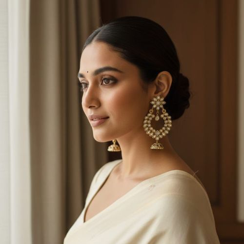 Grace your look with the timeless elegance of Kundan Chandbali earrings, a perfect blend of traditional charm and royal artistry. Inspired by the crescent moon, these earrings feature intricate Kundan work, reflecting the rich heritage of Indian craftsmanship. Embellished with delicate pearl drops and fine detailing, they exude sophistication and grandeur. Ideal for weddings, festive occasions, and cultural celebrations, these statement earrings pair beautifully with ethnic outfits like sarees, lehengas, and anarkalis. Despite their elaborate design, they are lightweight and comfortable to wear. Add these stunning Kundan Chandbalis to your collection for a graceful and regal finishing touch.