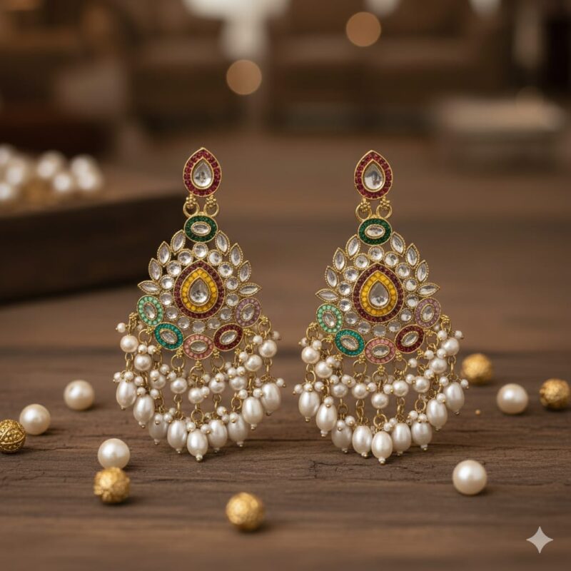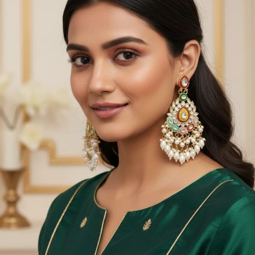 These Kundan Chandbali Earrings are an exquisite blend of Indian tradition and artistic elegance. The crescent (‘chand’) shape is beautifully detailed with shimmering Kundan stones set in a gleaming metal base, often finished with gold or matte polish. Intricate floral motifs or latticework are common, lending a delicate and regal feel. Pearls or small bead drops usually dangle at the bottom, adding graceful movement and a touch of softness. Lightweight yet eye-catching, these earrings are perfect for weddings, festivals, and ethnic celebrations. Pair them with a saree, lehenga, or Anarkali to enhance your ensemble with timeless charm.