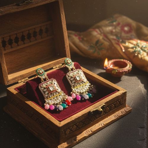 These Kundan earrings are a breathtaking blend of royal artistry and timeless elegance. Handmade using the traditional Kundan technique—where flawless glass or semi-precious stones are set with gleaming metal foils—they radiate a rich, luminous sparkle. Each earring features intricate designs with motifs inspired by Mughal and Rajput architecture, often accented with delicate enamel work (Meenakari) or pearl drops for added grace. Lightweight yet stunning, they beautifully frame the face and elevate both bridal attires and festive ensembles. Whether paired with a flowing lehenga or an elegant saree, these earrings promise to make a regal statement.