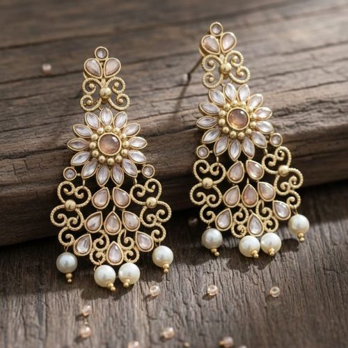 Make a grand statement with these stunning Kundan Polki Dangler Earrings adorned with elegant pearl drops. Crafted with intricate detailing, the earrings feature traditional Polki stones set in rich Kundan work, reflecting the regal beauty of Indian heritage. The design is elevated by lustrous pearls that add a soft, graceful touch to the bold, artistic structure. Perfect for weddings, festive celebrations, or special occasions, these danglers pair effortlessly with lehengas, sarees, or anarkalis. Lightweight yet striking, they offer a perfect blend of tradition and sophistication. Add timeless charm to your look with these exquisite Kundan Polki earrings that exude elegance.
