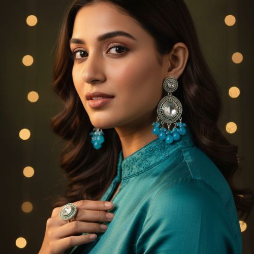 These Kundan‑style jhumka earrings are a dazzling fusion of tradition and color. Featuring intricate Kundan stone work set in a gleaming base, the dome‑shaped jhumka is accented by beautiful blue beaded drops that sway gracefully with every movement. The top stud is shaped with classic floral or motif detailing, enhancing the rich heritage look. Lightweight yet ornate, they’re ideal for weddings, festive celebrations, or any special event. The vibrant blue beads add a refreshing contrast to the golden and Kundany tones. Pair with sarees, lehengas, or Indo‑western outfits to complete a regal, eye‑catching ensemble.